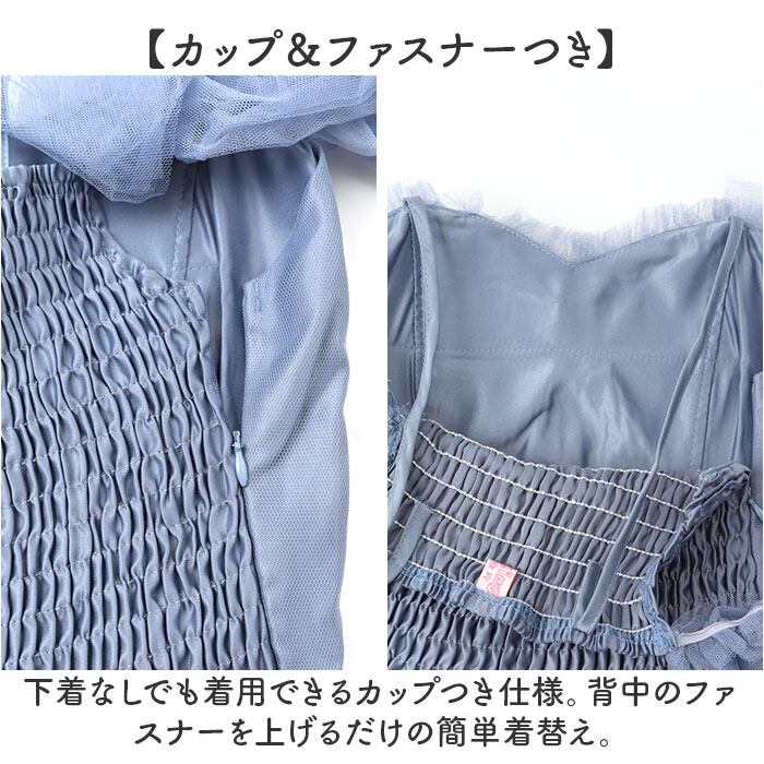 ・下着なしでも着用できるカップつき仕様。背中のファスナーを上げるだけの簡単着替え。