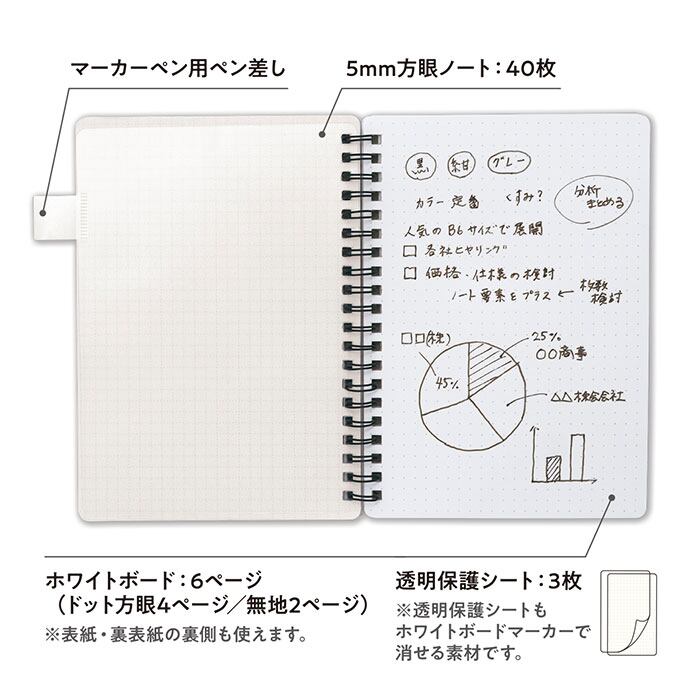・何度でも書いて消せるホワイトボード、6ページを装備。マーカーで消せる透明保護シート付き。