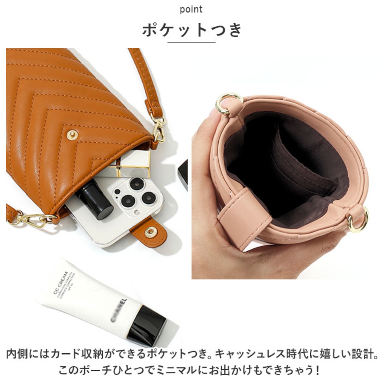 ・内側にはカード収納ができるポケットつき。キャッシュレス時代に嬉しい設計。このポーチひとつでミニマルにお出かけもできちゃう!