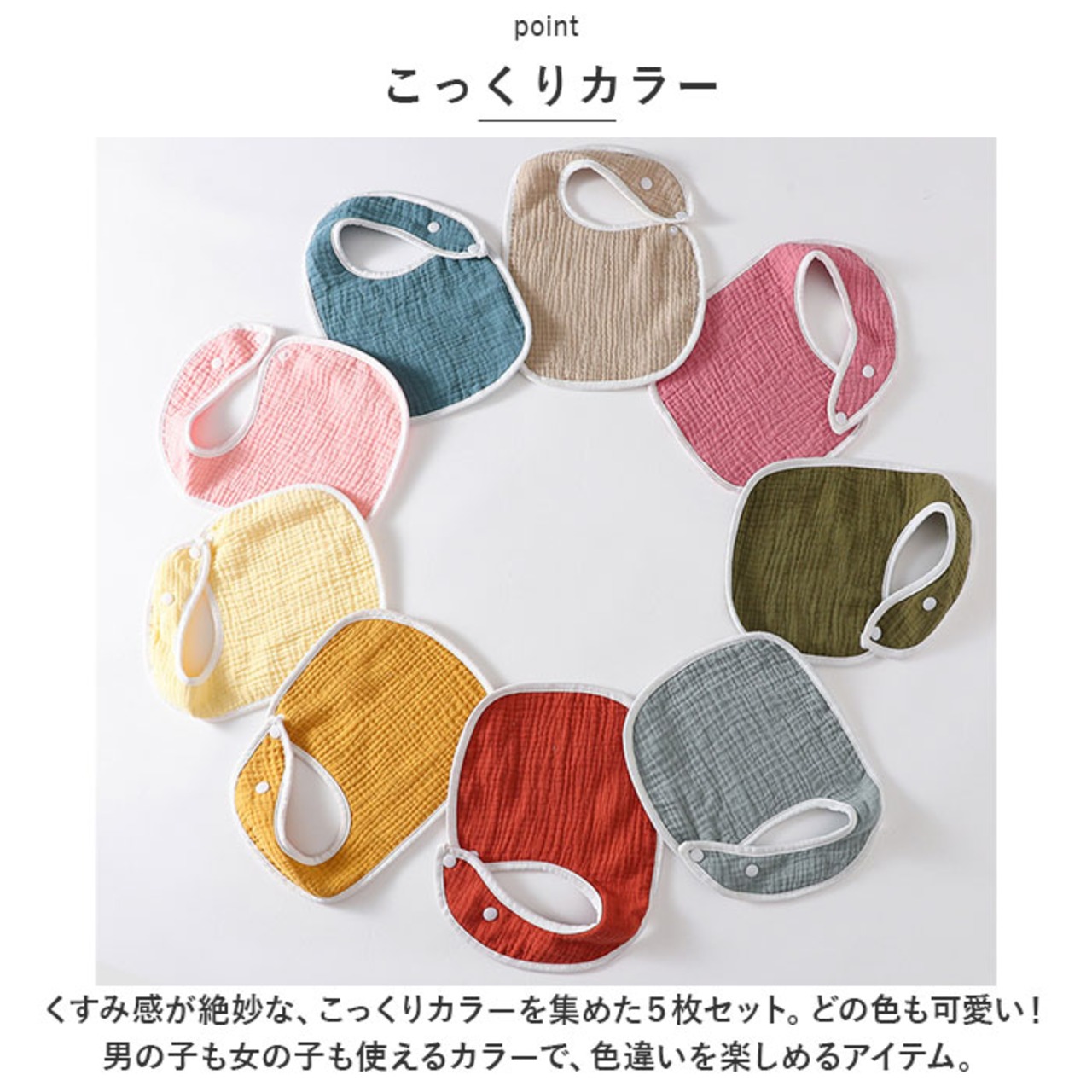・くすみ感が絶妙な、こっくりカラーを集めた5枚セット。どの色も可愛い!男の子も女の子も使えるカラーで、色違いを楽しめるアイテム。