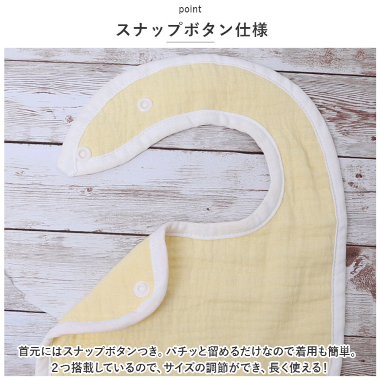 ・首元にはスナップボタンつき。パチッと留めるだけなので着用も簡単。2つ搭載しているので、サイズの調節ができ、長く使える!