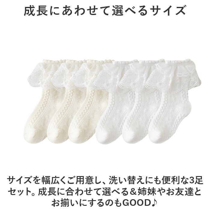 ・サイズを幅広くご用意し、洗い替えにも便利な3足セット。成長に合わせて選べる&姉妹やお友達とお揃いにするのもGOOD♪