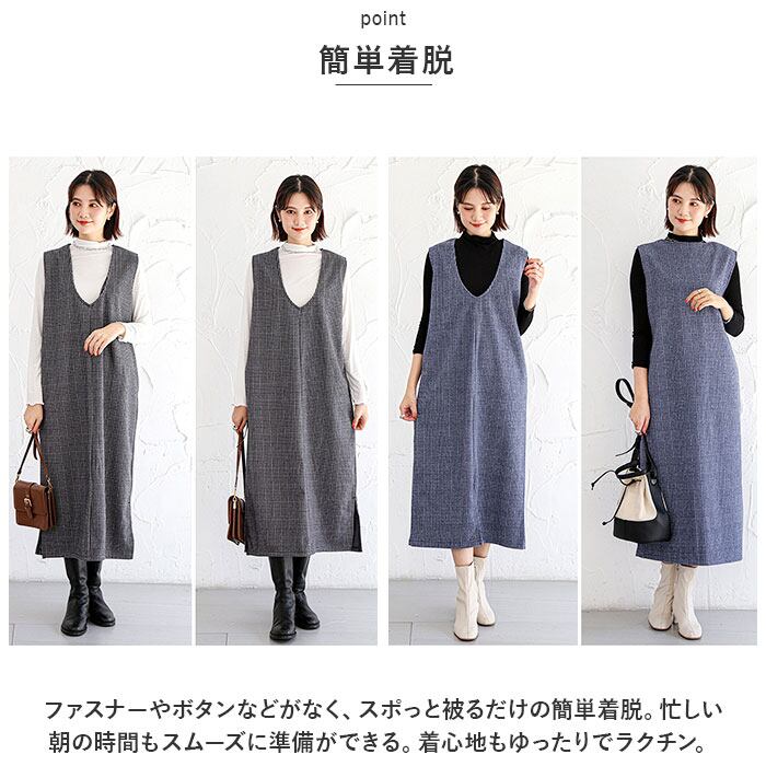 ・ファスナーやボタンなどがなく、スポっと被るだけの簡単着脱。忙しい朝の時間もスムーズに準備ができる。着心地もゆったりでラクチン。