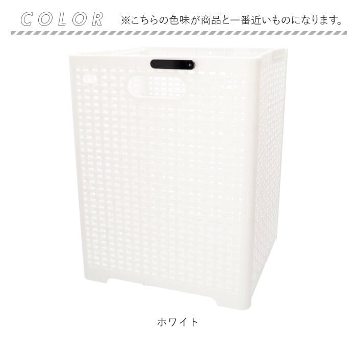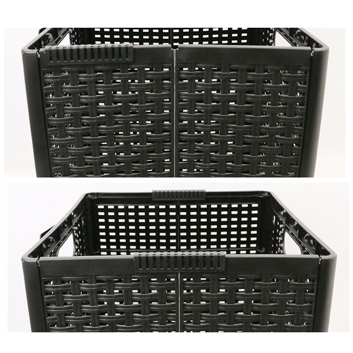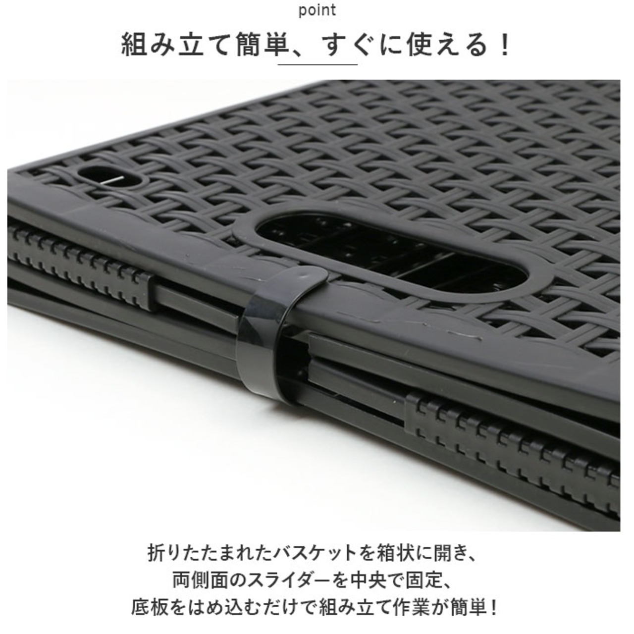 ・折りたたまれたバスケットを箱状に開き、両側面のスライダーを中央で固定、底板をはめ込むだけで組み立て作業が簡単!