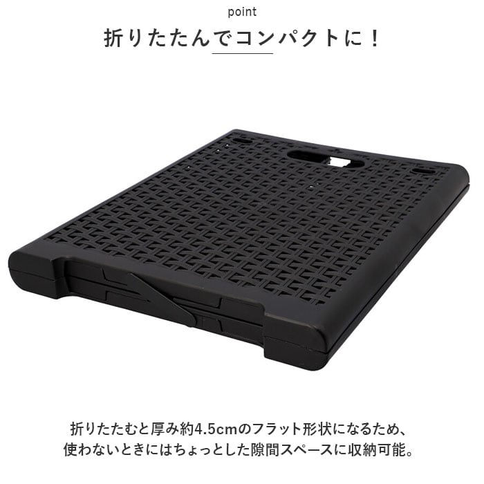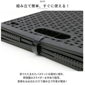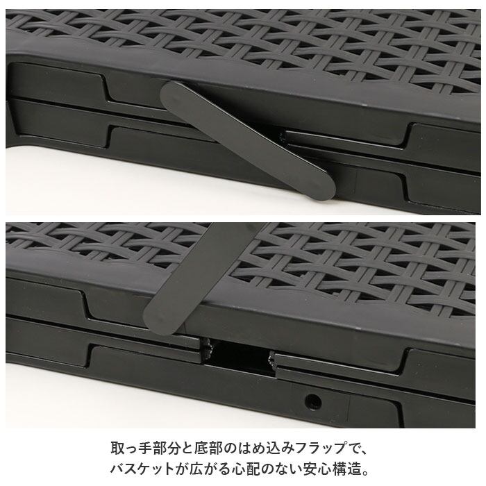 ・折りたたむと厚み約4.5cmのフラット形状になるため、使わないときにはちょっとした隙間スペースに収納可能。取っ手部分と底部のはめ込みフラップで、バスケットが広がる心配のない安心構造。