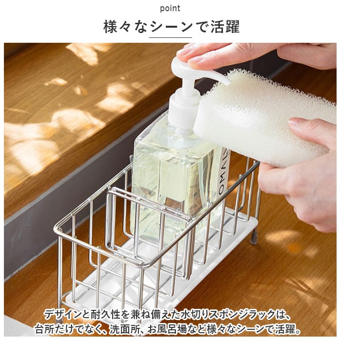 ・デザインと耐久性を兼ね備えた水切りスポンジラックは、台所だけでなく、洗面所、お風呂場など様々なシーンで活躍。