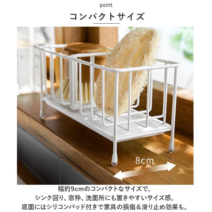 ・幅約9cmのコンパクトなサイズで、シンク回り、窓枠、洗面所にも置きやすいサイズ感。底面にはシリコンパッド付きで家具の損傷&滑り止め効果も。