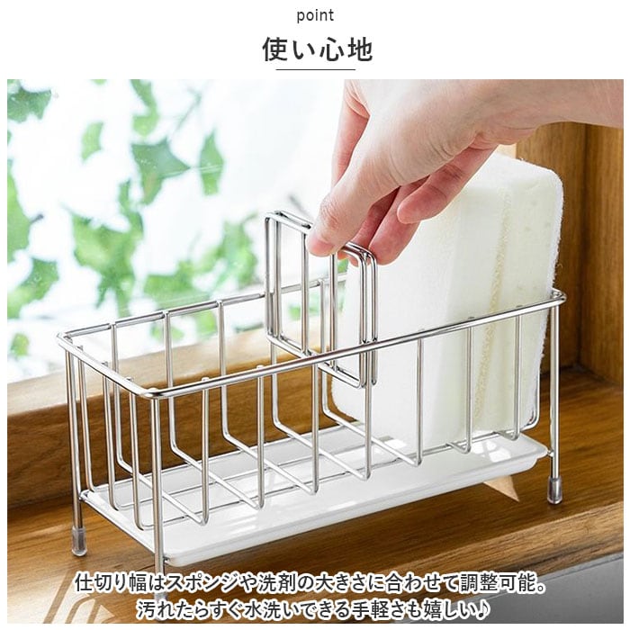 ・仕切り幅はスポンジや洗剤の大きさに合わせて調整可能。汚れたらすぐ水洗いできる手軽さも嬉しい♪