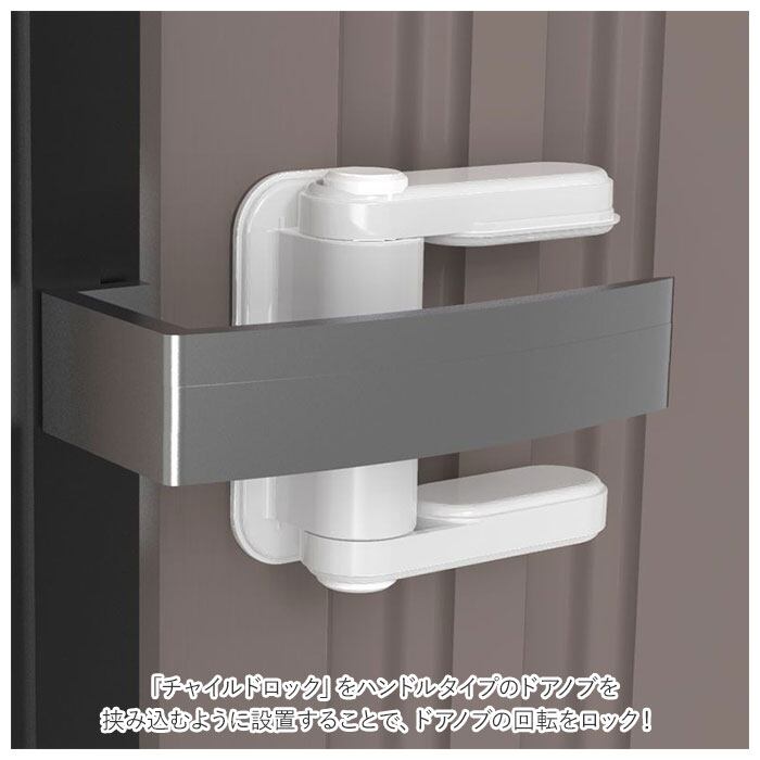「チャイルドロック」をハンドルタイプのドアノブを挟み込むように設置することで、ドアノブの回転をロック!お子さまが勝手にドアを開けることを防ぎ、トラブルを未然に回避。