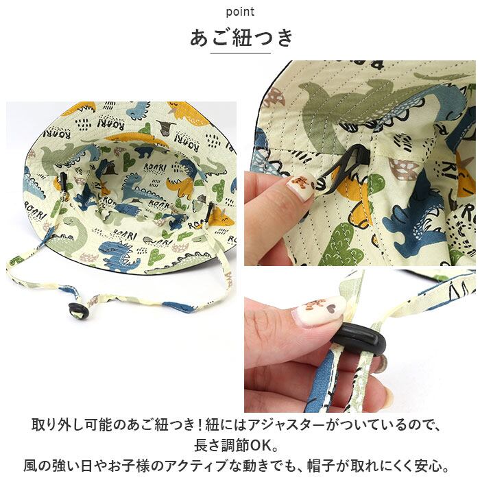 ・取り外し可能のあご紐つき!紐にはアジャスターがついているので、長さ調節OK。風の強い日やお子様のアクティブな動きでも、帽子が取れにくく安心。
