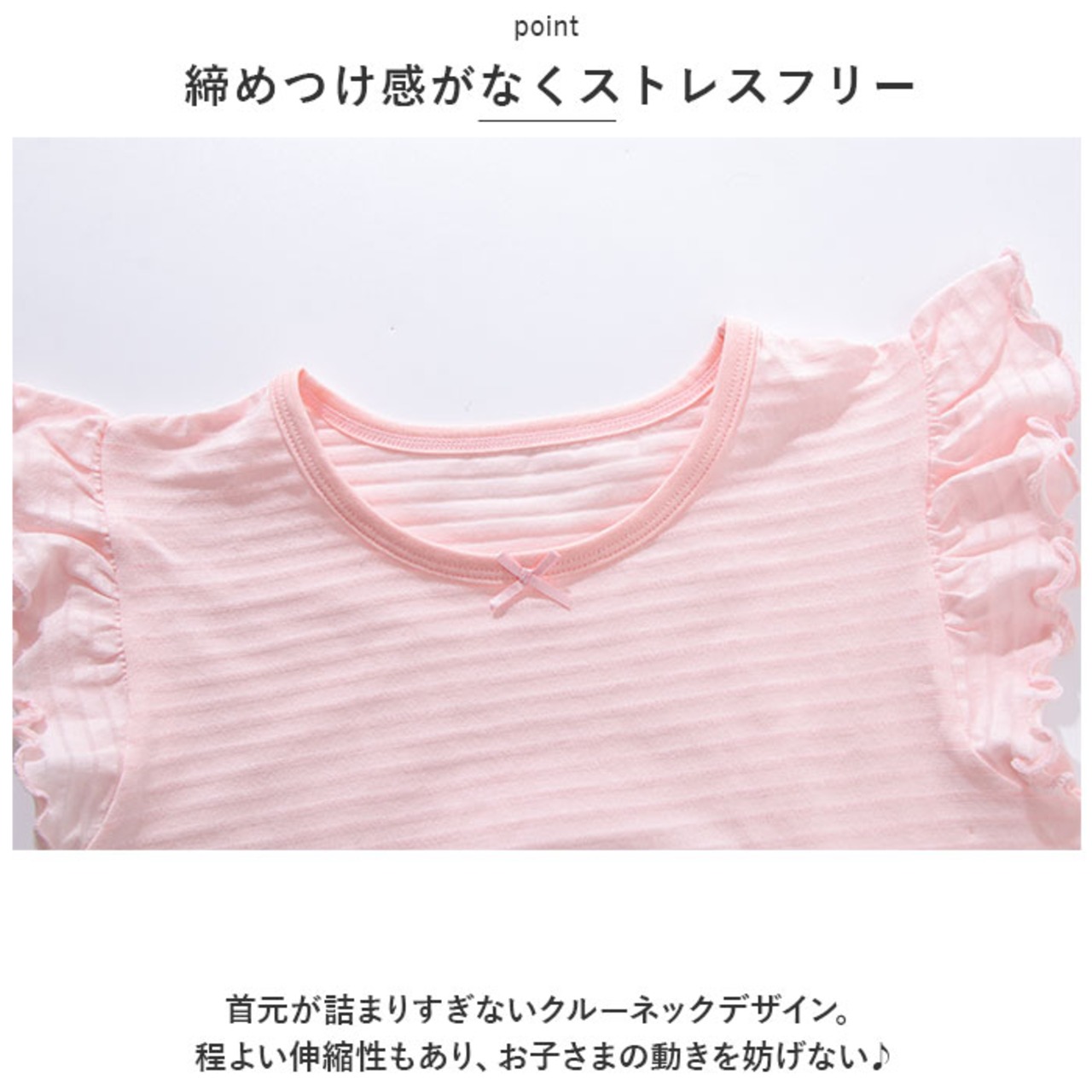 ・首元が詰まりすぎないクルーネックデザイン。程よい伸縮性もあり、お子さまの動きを妨げない♪