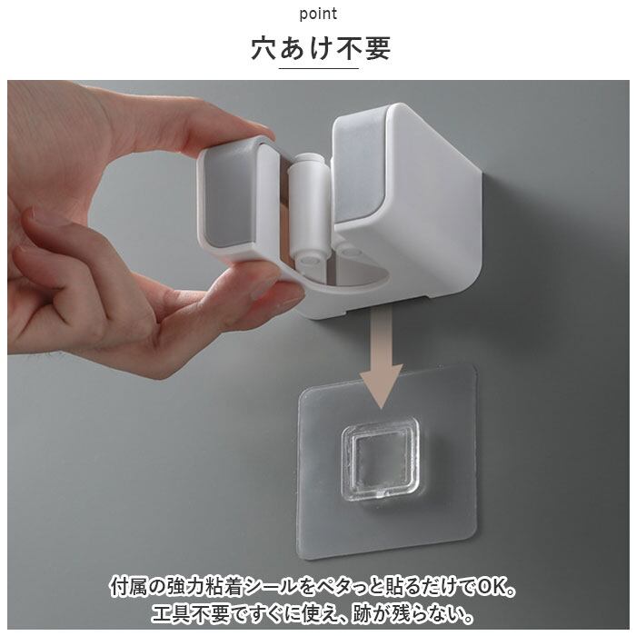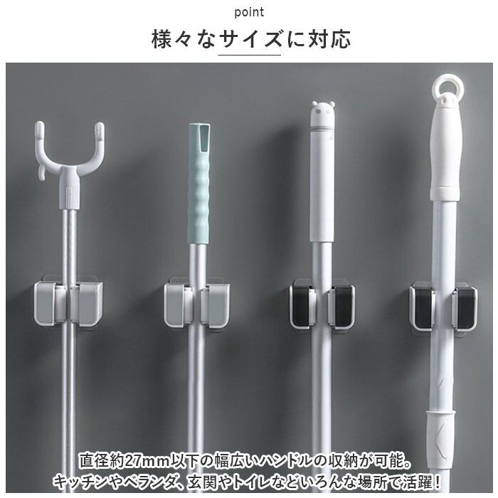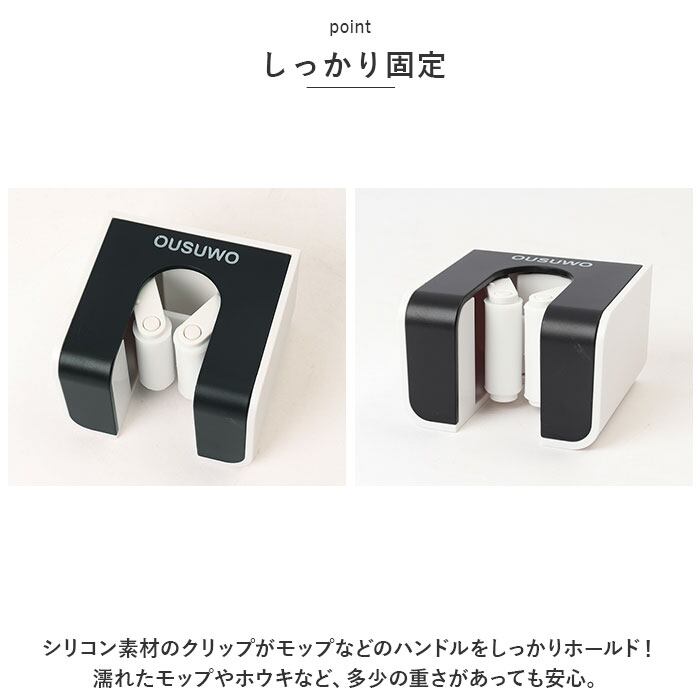 ・シリコン素材のクリップがモップなどのハンドルをしっかりホールド!濡れたモップやホウキなど、多少の重さがあっても安心。