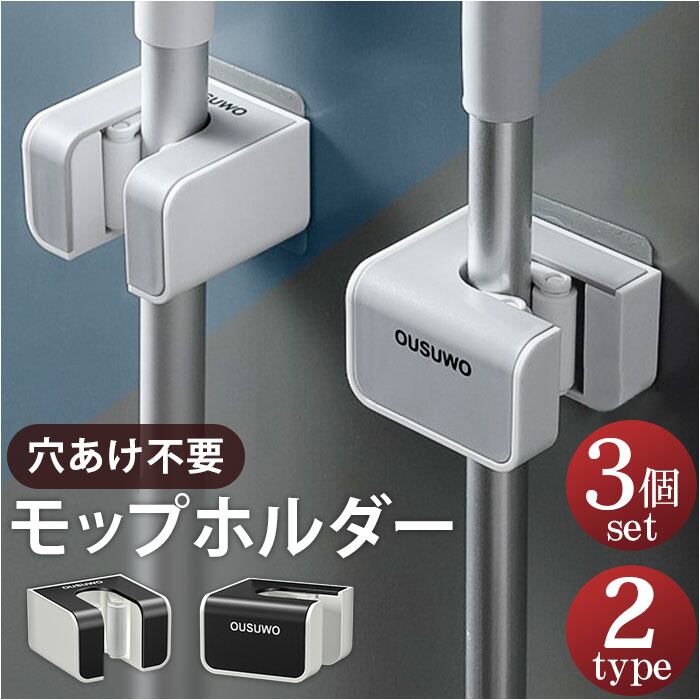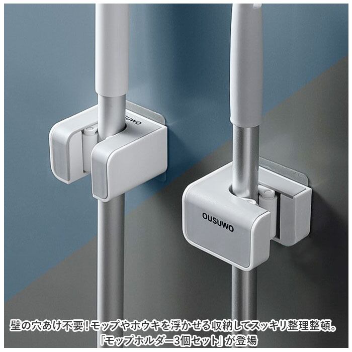 ・壁の穴あけ不要!モップやホウキを浮かせる収納してスッキリ整理整頓。「モップホルダー3個セット」が登場