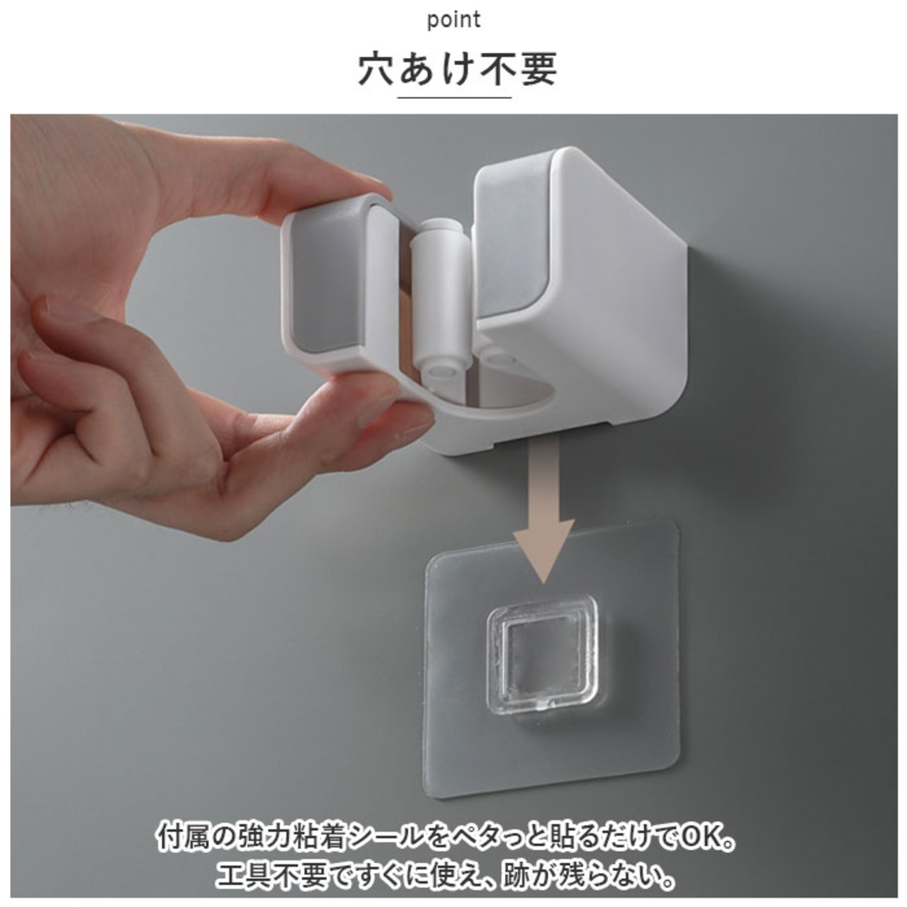 ・穴あけ不要◎付属の強力粘着シールをペタっと貼るだけでOK。工具不要ですぐに使え、跡が残らない。