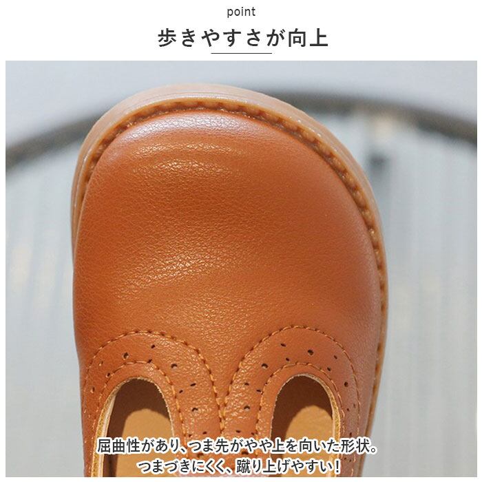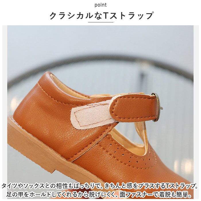 ・タイツやソックスとの相性もばっちりで、きちんと感をプラスするTストラップ。足の甲をホールドしてくれるから脱げにくく、面ファスナーで着脱も簡単。