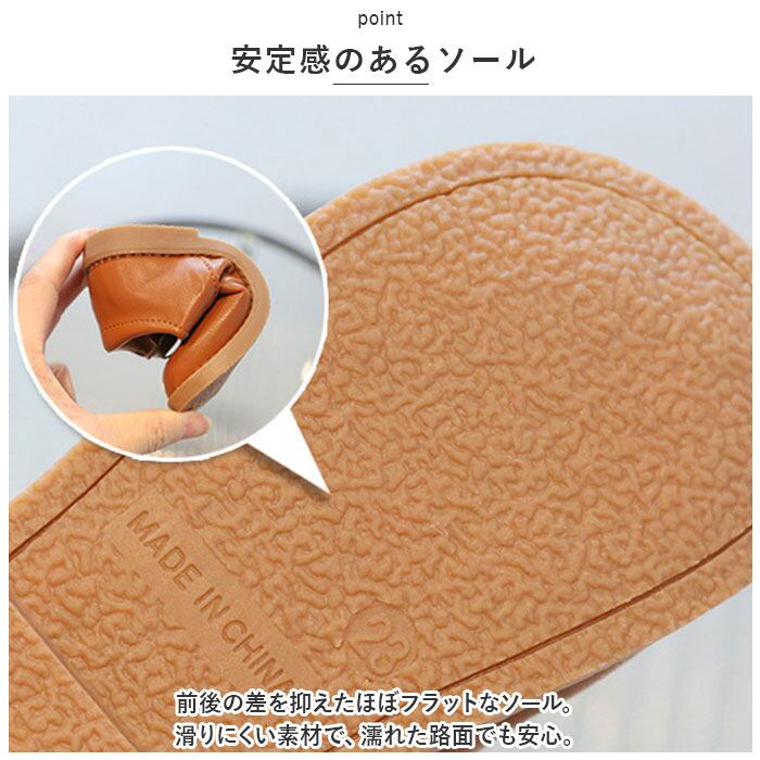 ・前後の差を抑えたほぼフラットなソール。滑りにくい素材で、濡れた路面でも安心。