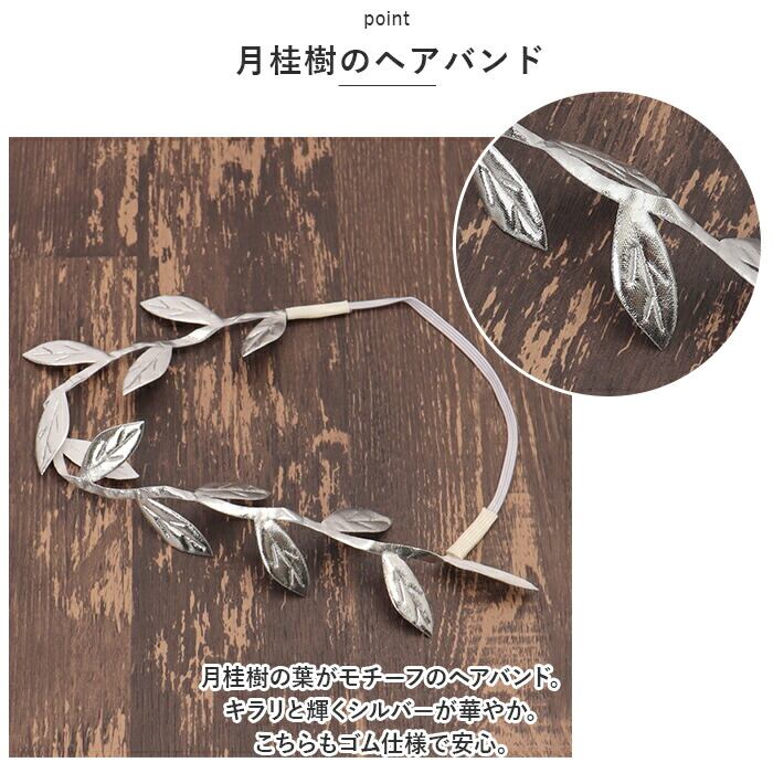 ・月桂樹の葉がモチーフのヘアバンド。キラリと輝くシルバーが華やか。こちらもゴム仕様で安心。
