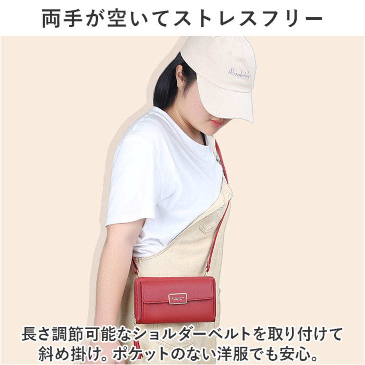 ・長さ調節可能なショルダーベルトを取り付けて斜め掛け。ポケットのない洋服でも安心。