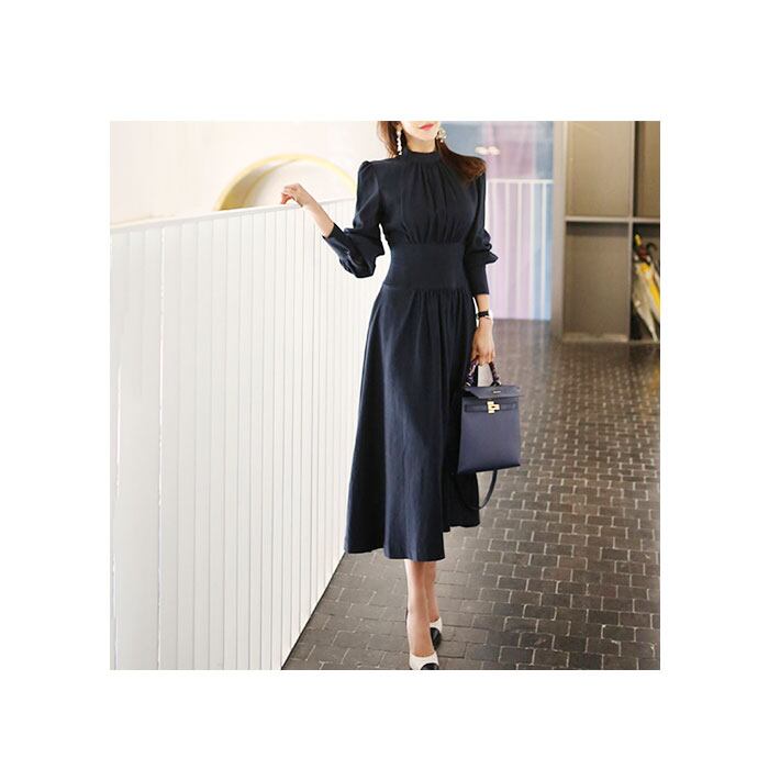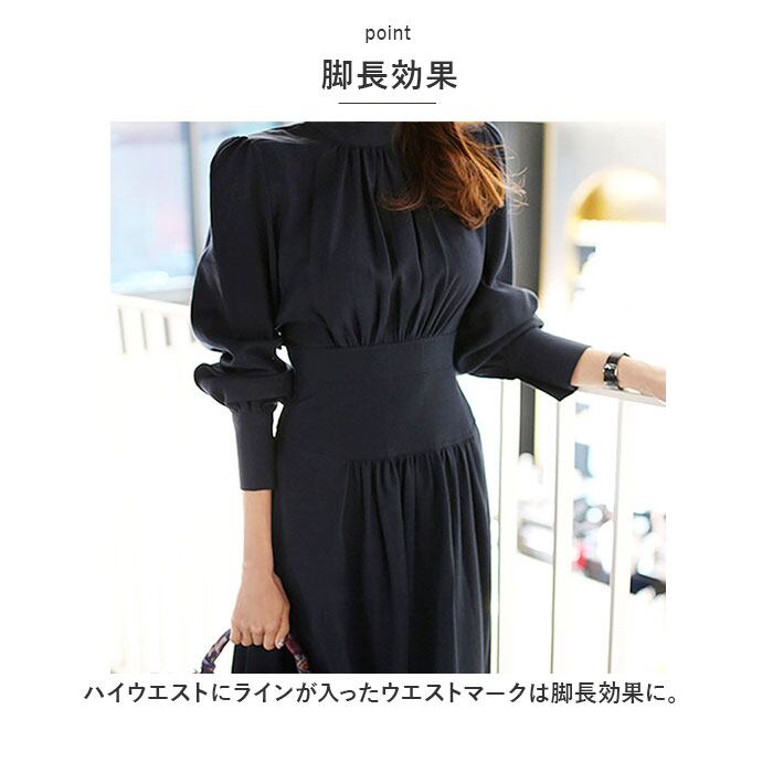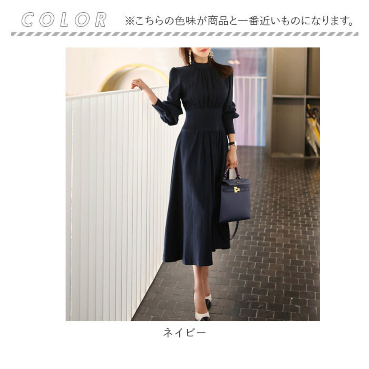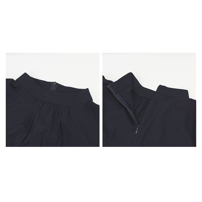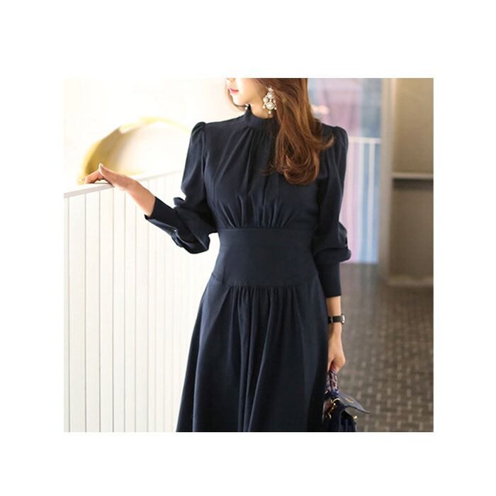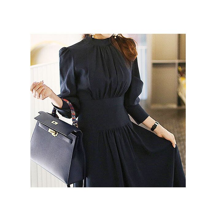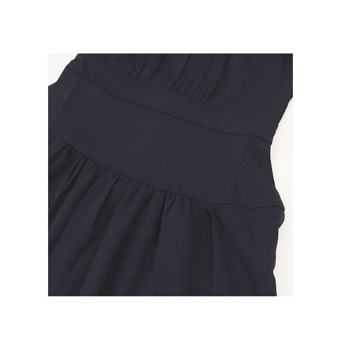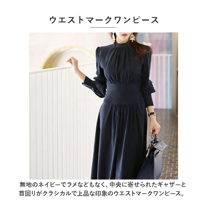 ・無地のネイビーでラメなどもなく、中央に寄せられたギャザーと首回りがクラシカルで上品な印象のウエストマークワンピース。
