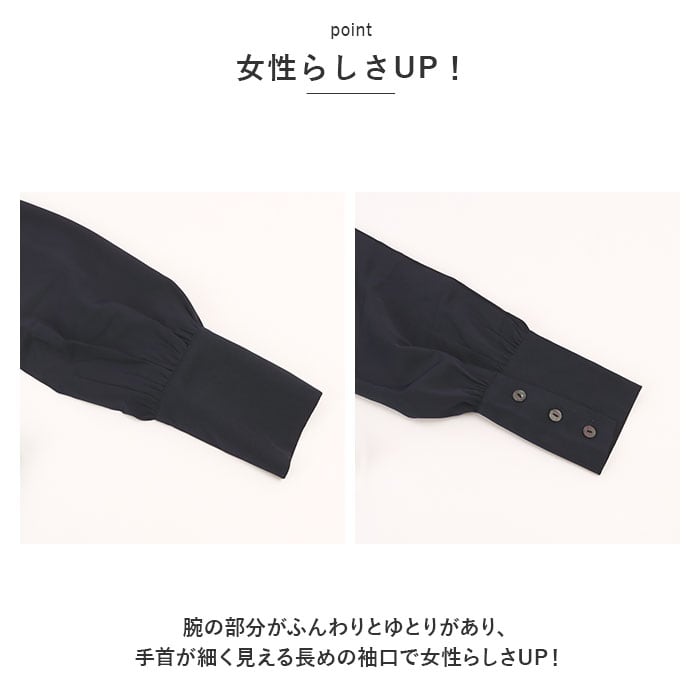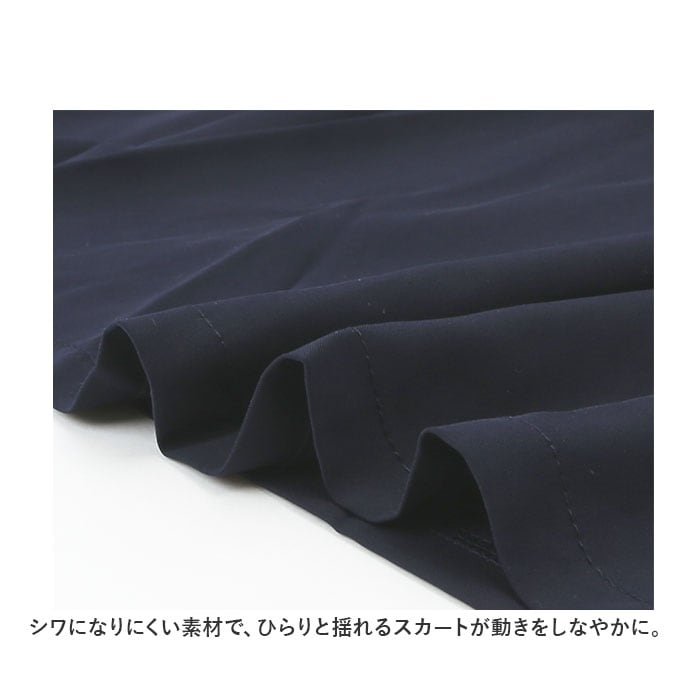 ・シワになりにくい素材で、ひらりと揺れるスカートが動きをしなやかに。腕の部分がふんわりとゆとりがあり、手首が細く見える長めの袖口で女性らしさUP!