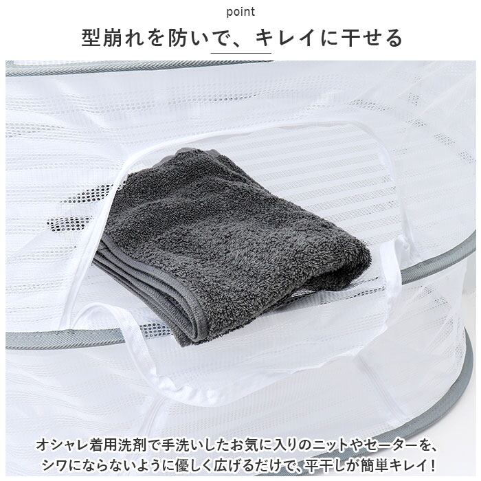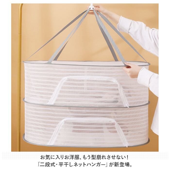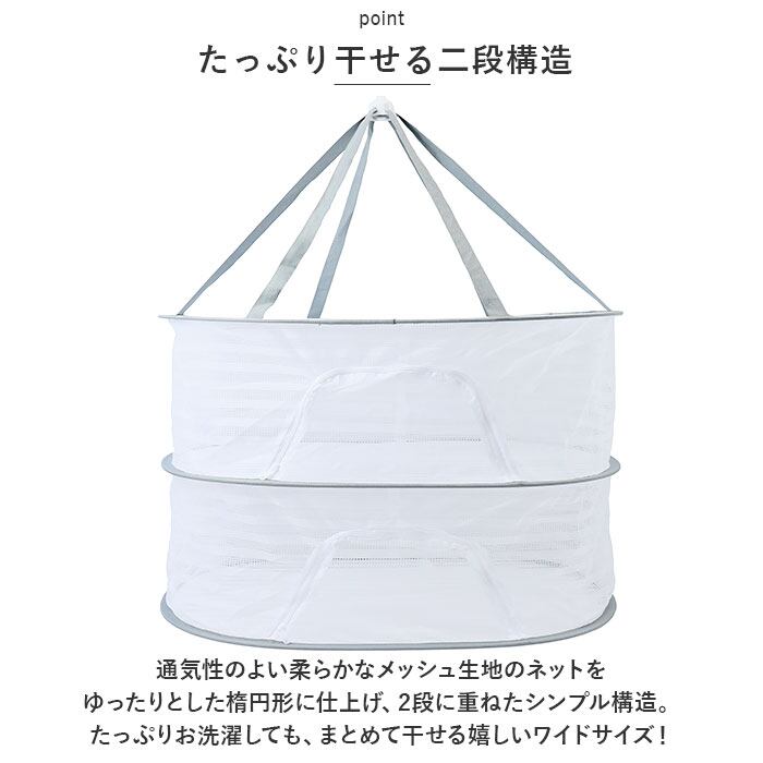 ・通気性のよい柔らかなメッシュ生地のネットをゆったりとした楕円形に仕上げ、2段に重ねたシンプル構造。たっぷりお洗濯しても、まとめて干せる嬉しいワイドサイズ!