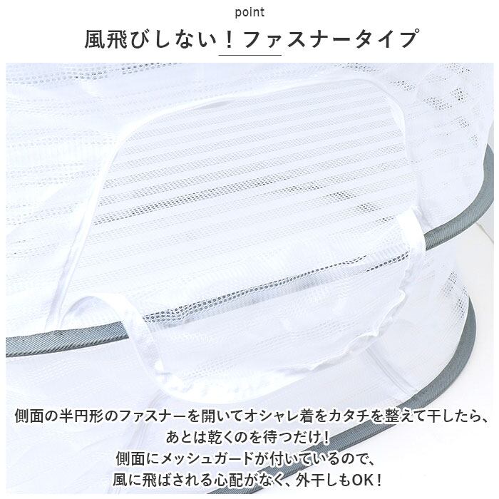 ・側面の半円形のファスナーを開いてオシャレ着をカタチを整えて干したら、あとは乾くのを待つだけ!側面にメッシュガードが付いているので、風に飛ばされる心配がなく、外干しもOK!