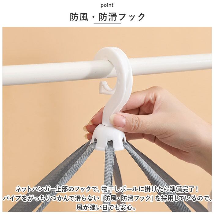 ・ネットハンガー上部のフックで、物干しポールに掛けたら準備完了!パイプをがっちりつかんで滑らない「防風・防滑フック」を採用しているので、風が強い日でも安心。