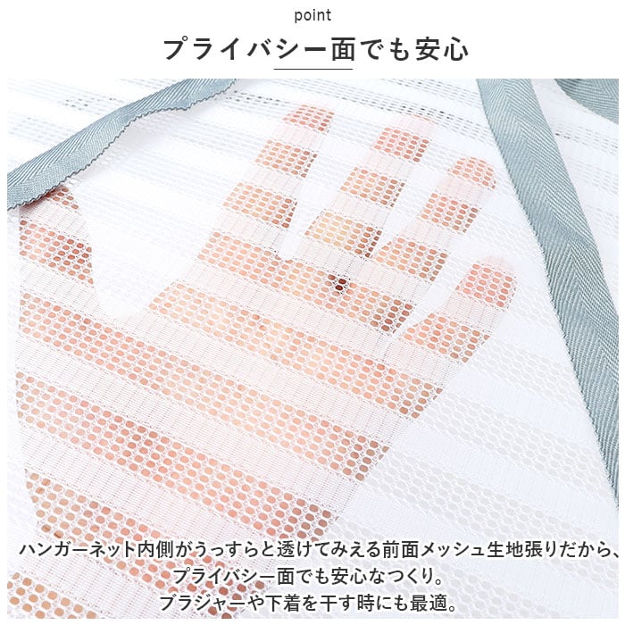 ・ハンガーネット内側がうっすらと透けてみえる前面メッシュ生地張りだから、プライバシー面でも安心なつくり。ブラジャーや下着を干す時にも最適。
