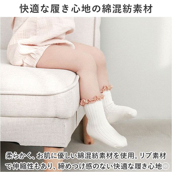 ・履き口にギンガムチェックのフリルデザインがポイント!ゴムが入っていないので、跡がつきにくいのも嬉しい♪
