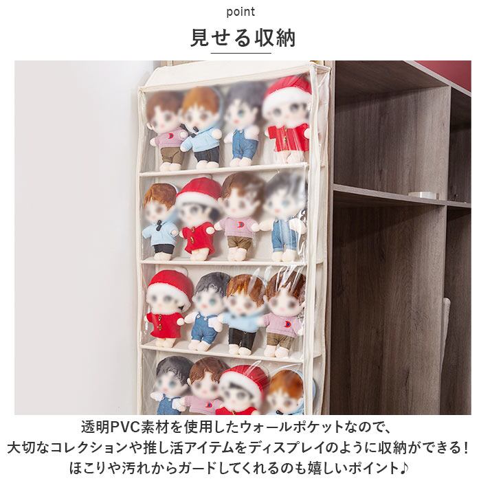 ・透明PVC素材を使用したウォールポケットなので、大切なコレクションや推し活アイテムをディスプレイのように収納ができる!ほこりや汚れからガードしてくれるのも嬉しいポイント♪