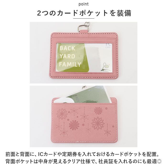 ・前面と背面に、ICカードや定期券を入れておけるカードポケットを配置。背面ポケットは中身が見えるクリア仕様で、社員証を入れるのにも最適◎