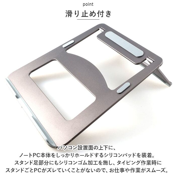 ・スタンド足部分にもシリコンゴム加工を施し、タイピング作業時にスタンドごとPCがズレていくことがないので、お仕事や作業がスムーズ。