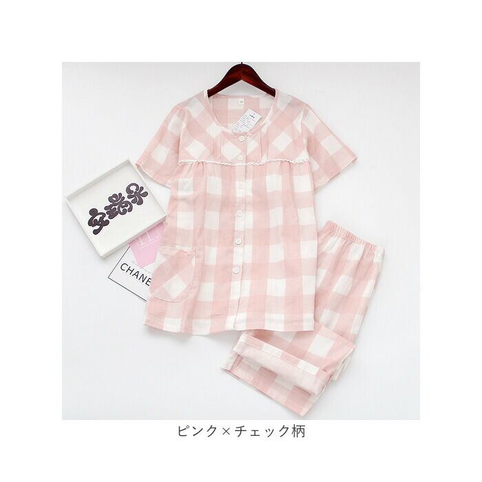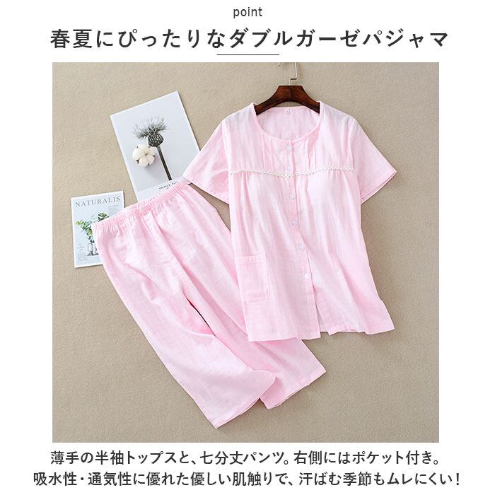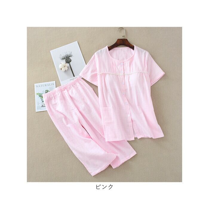 パジャマ レディース 半袖 綿100% セット 通販 半袖パジャマ 上下セット パンツ 長ズボン ルームウェア 部屋着 ダブルガーゼ ガーゼ 胸元レース 前開き 薄手 襟なし カップ付き かわいい 春 夏 大きいサイズ 快適