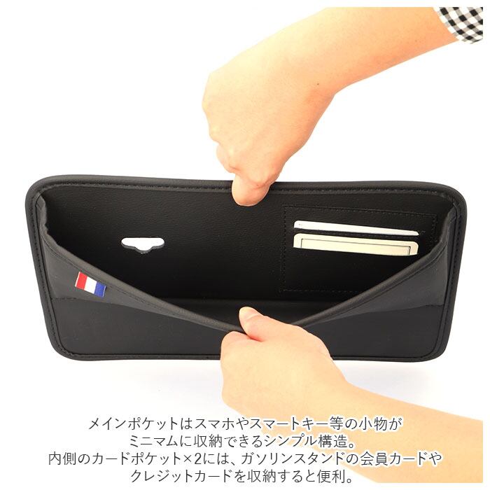 ・座席シートの隙間にしっかりと差し込むことで、急ブレーキをかけた時でもポケットがズレにくく、シート脇に小物を落としてしまう心配のない安心設計。
