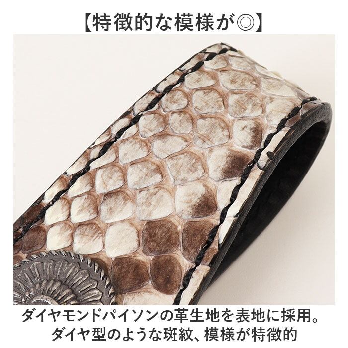 ・ダイヤモンドパイソンの革生地を表地に採用。ダイヤ型のような斑紋、模様が特徴的