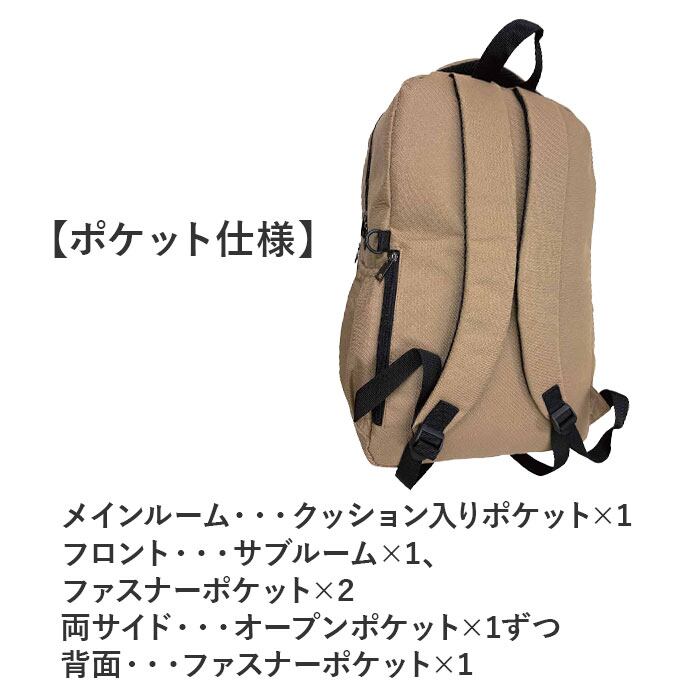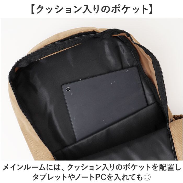 ・メインルームには、クッション入りのポケットを配置しタブレットやノートPCを入れても◎