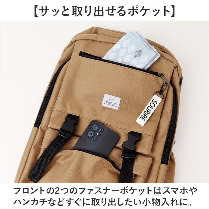 ・フロントの2つのファスナーポケットはスマホやハンカチなどすぐに取り出したい小物入れに。