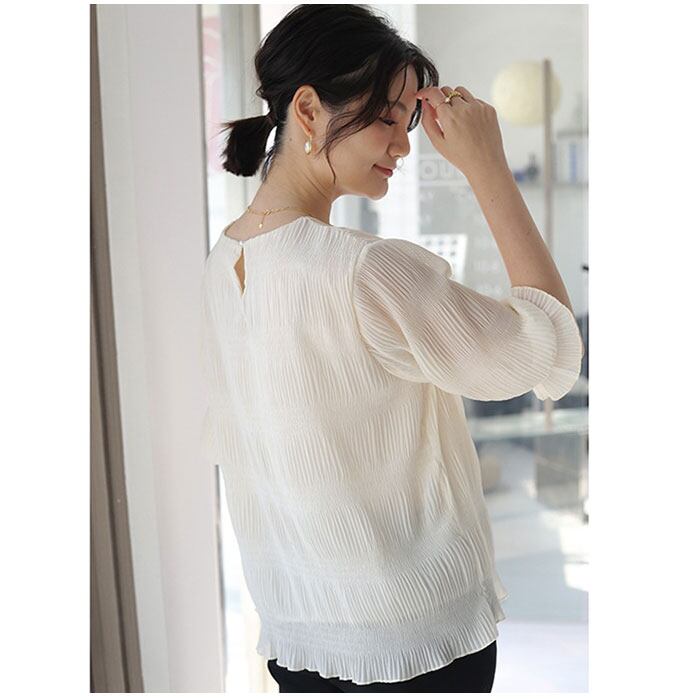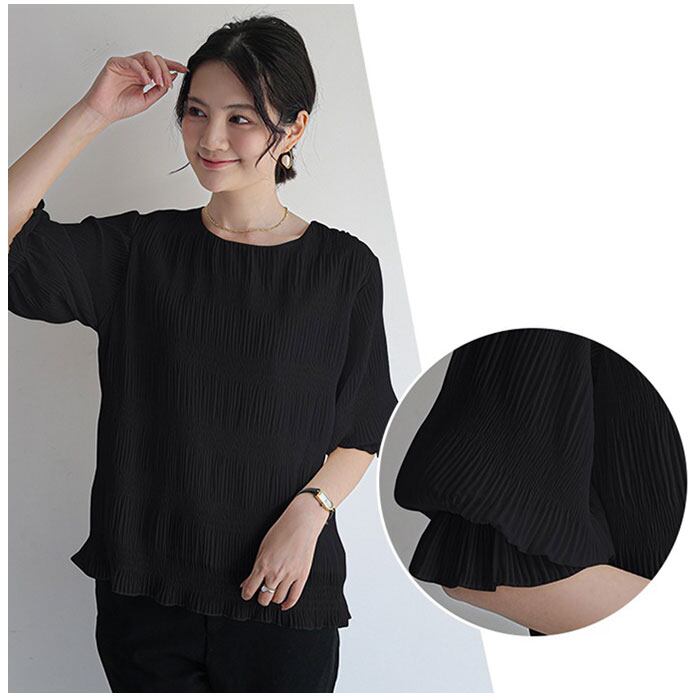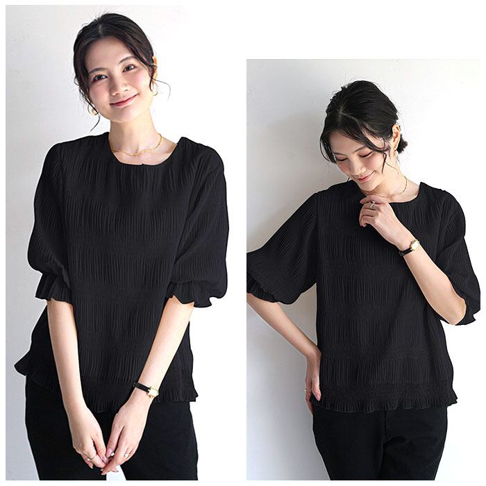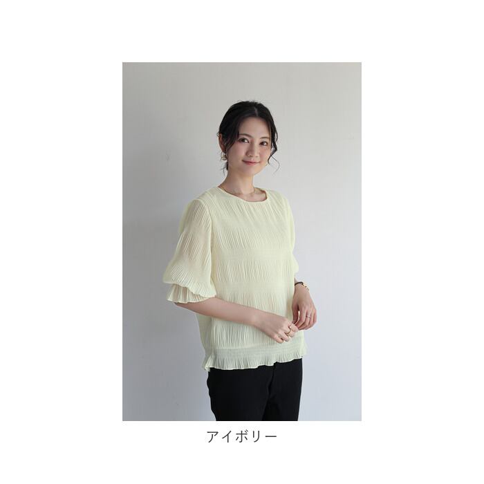 ・袖部分はふわっと丸みのあるフォルムで、気になる二の腕まわりもおしゃれにカバー。袖口にピタッと留まるゴムが入った5分袖タイプ。