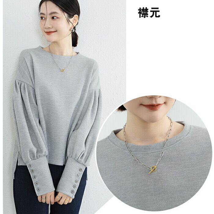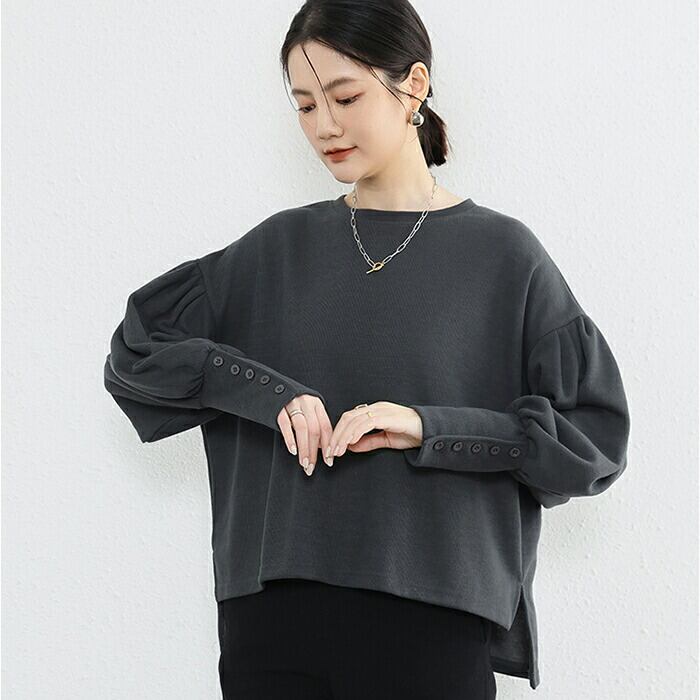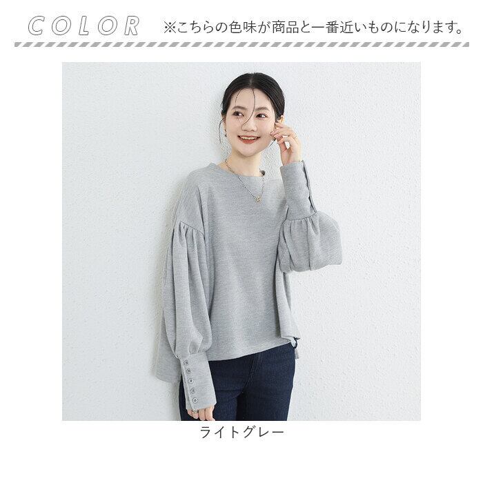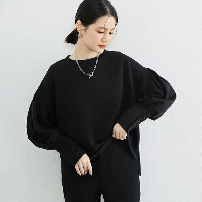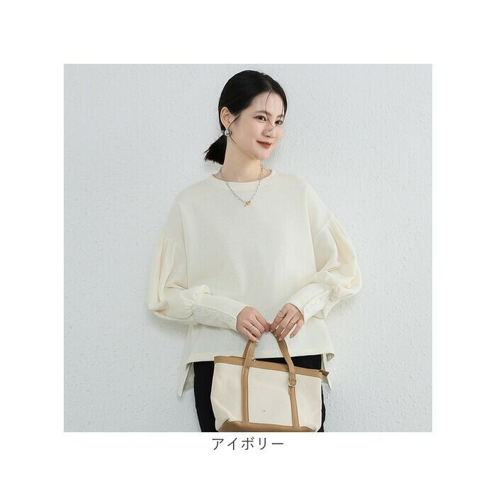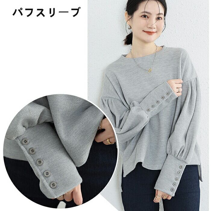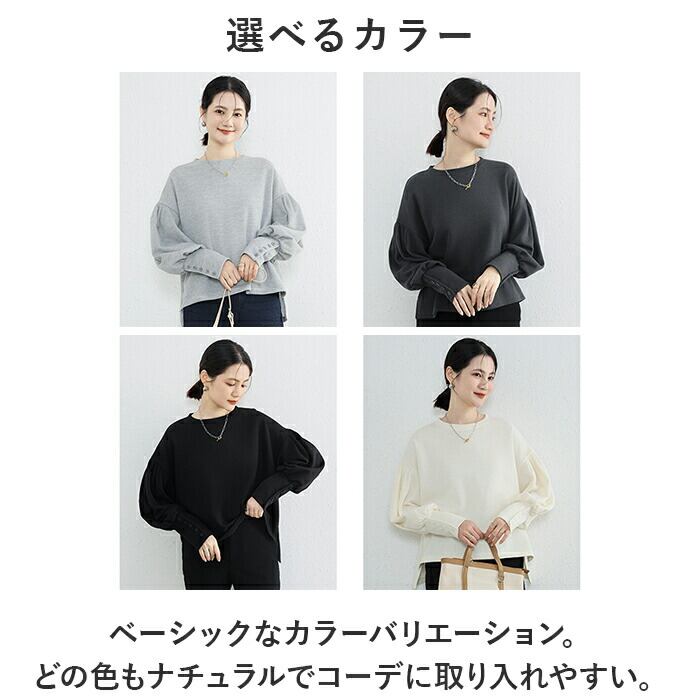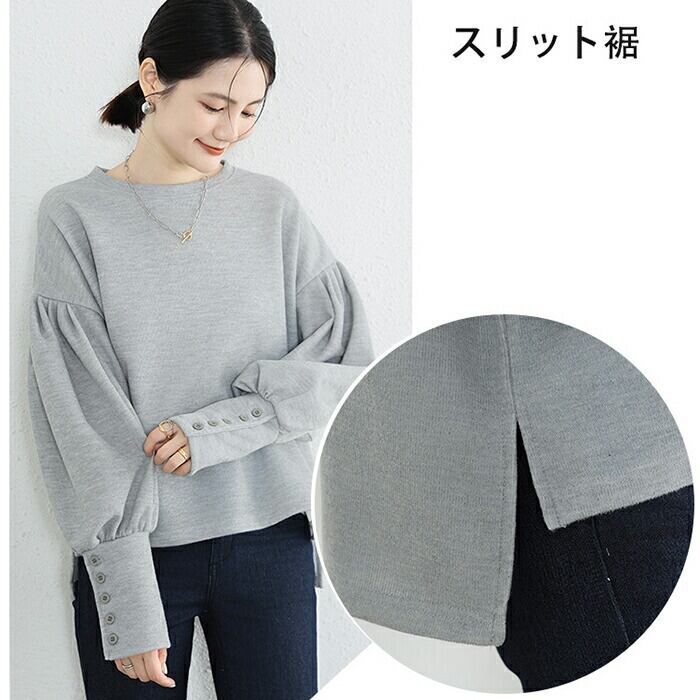 バルーンスリーブ カットソー レディース 通販 プルオーバー 袖バルーン ぽわん袖 袖コンシャス 袖 ボリューム ラウンドネック 長袖 体型カバー ゆったり 丸首 ドロップショルダー 無地 シンプル スリット デザイン おしゃれ トップス