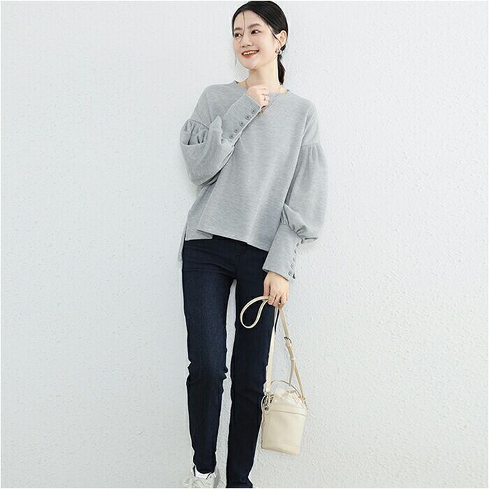 ・シンプルに見えて、しっかり旬コーデが楽しめるカットソー。ぼわん袖×タイトなボタン部分の絶妙なバランスが魅力。