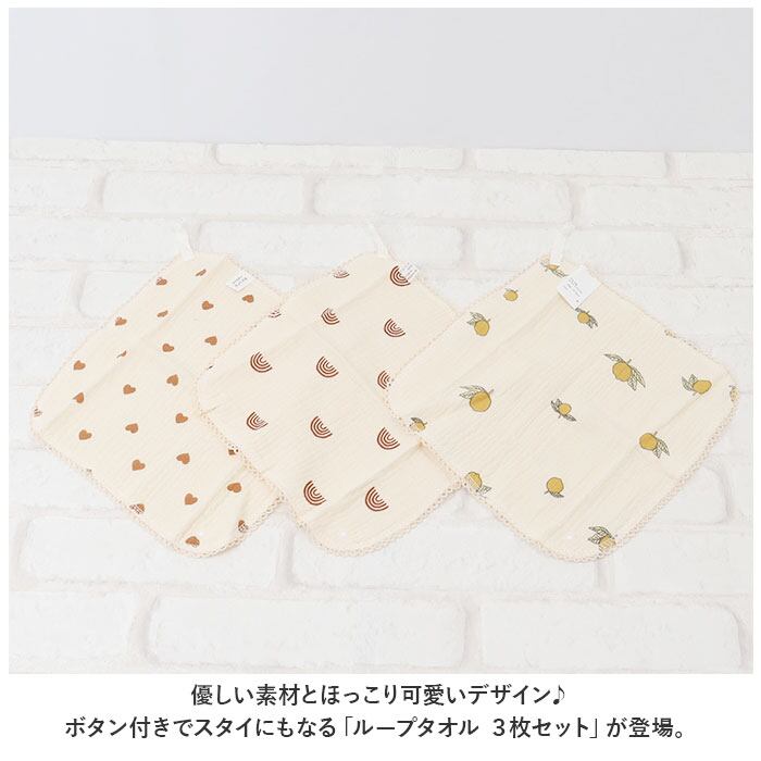 ・優しい素材とほっこり可愛いデザイン♪ボタン付きでスタイにもなる「ループタオル 3枚セット」が登場。