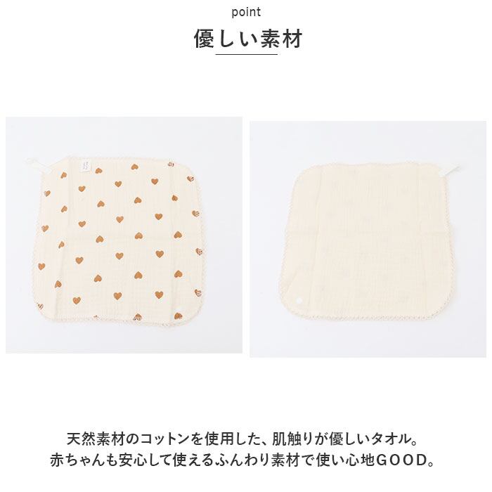 ・天然素材のコットンを使用した、肌触りが優しいタオル。赤ちゃんも安心して使えるふんわり素材で使い心地GOOD。