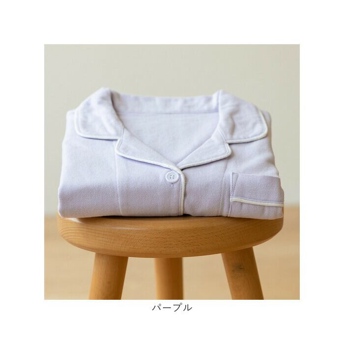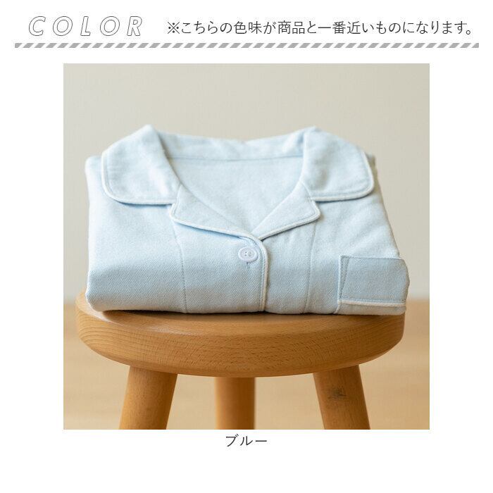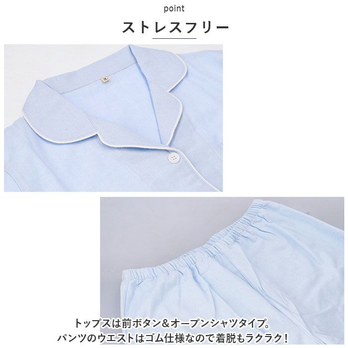 ・トップスは前ボタン&オープンシャツタイプ。パンツのウエストはゴム仕様なので着脱もラクラク!