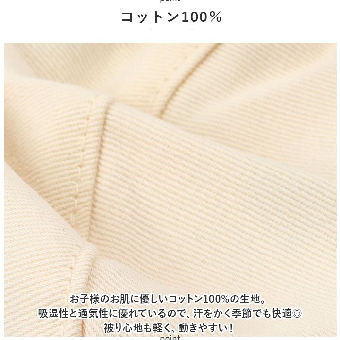 ・お子様のお肌に優しいコットン100%の生地。吸湿性と通気性に優れているので、汗をかく季節でも快適◎被り心地も軽く、動きやすい!