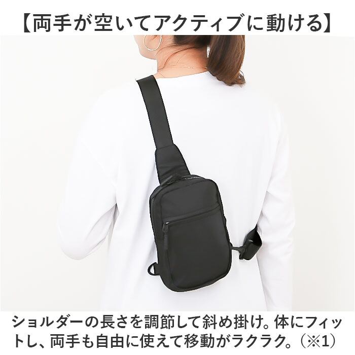 ・ショルダーの長さを調節して斜め掛け。体にフィットし、両手も自由に使えて移動がラクラク。