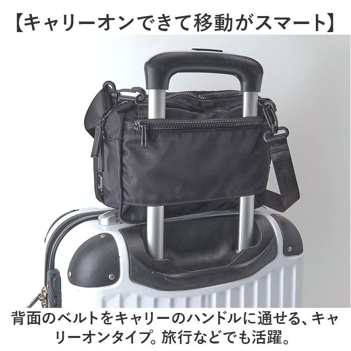 ・背面のベルトをキャリーのハンドルに通せる、キャリーオンタイプ。旅行などでも活躍。