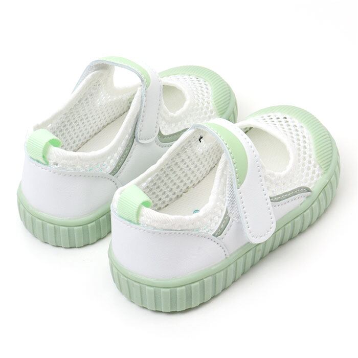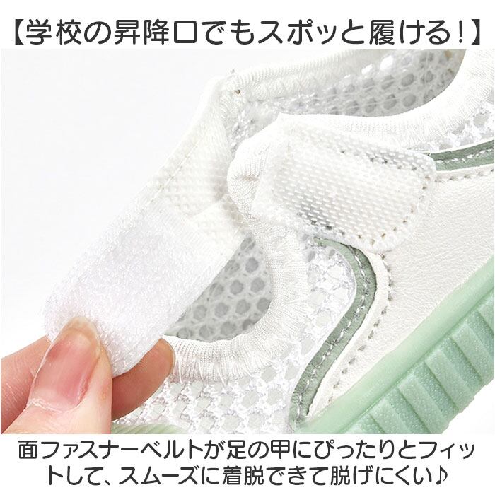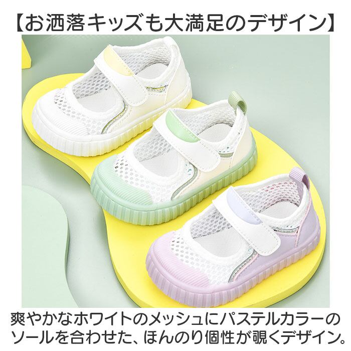 ・爽やかなホワイトのメッシュにパステルカラーのソールを合わせた、ほんのり個性が覗くデザイン。学年カラーのオーソドックスな上履きでは満足できないお洒落キッズにオススメ!