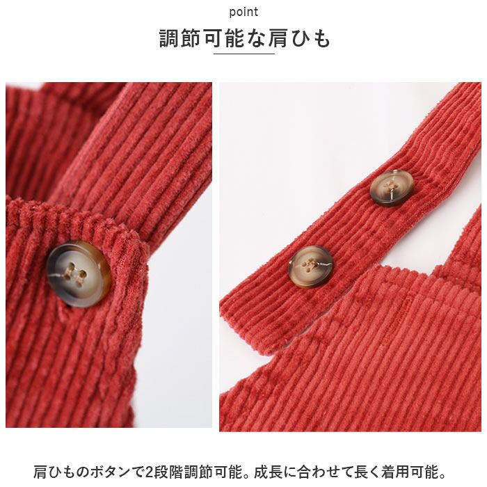 ・肩ひものボタンで2段階調節可能。成長に合わせて長く着用可能。