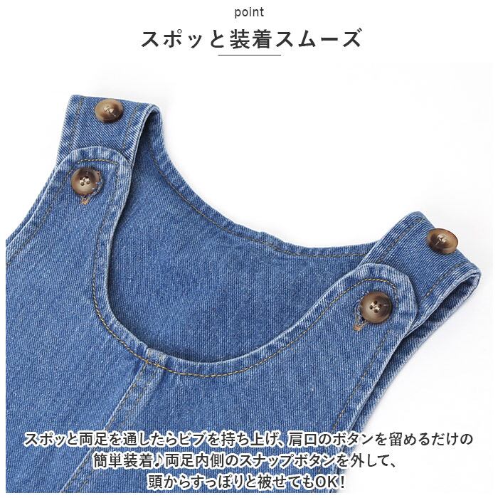 ・スポッと両足を通したらビブを持ち上げ、肩口のボタンを留めるだけの簡単装着♪両足内側のスナップボタンを外して、頭からすっぽりと被せてもOK!