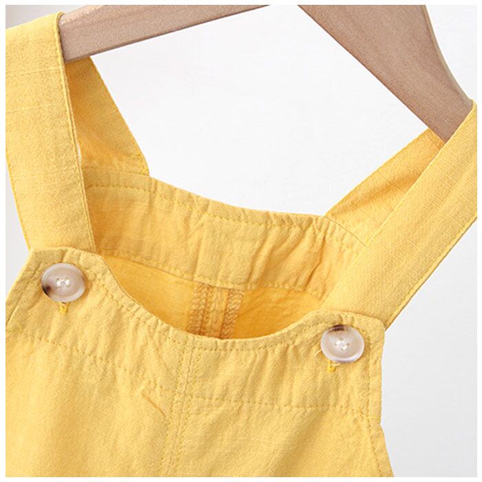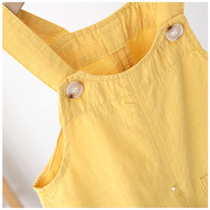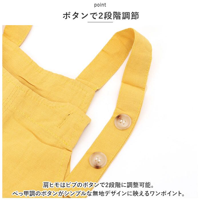 ・肩ヒモはビブのボタンで2段階に調整可能。べっ甲調のボタンがシンプルな無地デザインに映えるワンポイント。